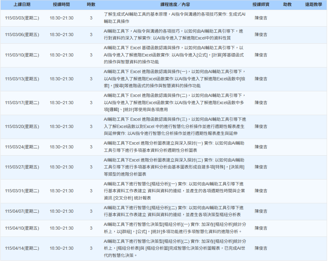 ☆ 正式報名時間:115/02/01(12:00)~ 115/02/28(18:00) ◆ 課程代碼:169747 ◆ 開課日期:115/03/03 ~ 115/04/14 (每週二、五) ◆ 上課時間:18:00~21:00 ◆ 時數:共36小時 ◆ 課程費用:$ 6,840 元 ◆ 補助參訓費用:一般身份 80 % 、 特定身份 100 %
